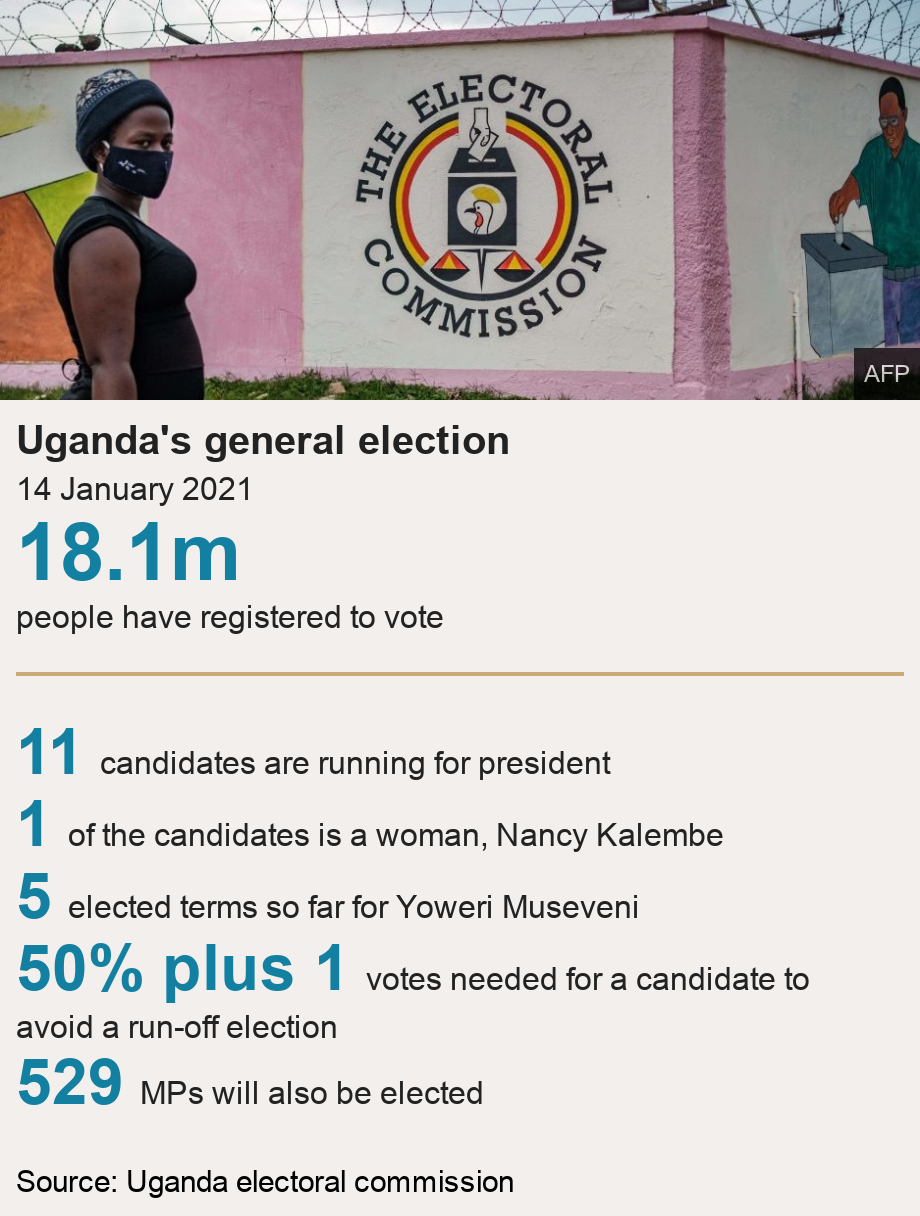 Ugandan presidential election open at 07:00 local time (04:00 gmt) today, but results no dey expected before saturday. The ugandan authorities appear to have ordered internet providers to shut down the whole internet at 19:00 local time (16:00 gmt) on the eve of the election, according to a letter shared by journalist samira sawlani. The internet has been cut off in uganda as voters cast their ballots in a hotly contested election. Please use chrome browser for a more accessible video player. The electoral commission said in a uganda's election commission on tuesday published a roadmap for presidential and legislative elections in early 2021, assuaging fears the coronavirus.